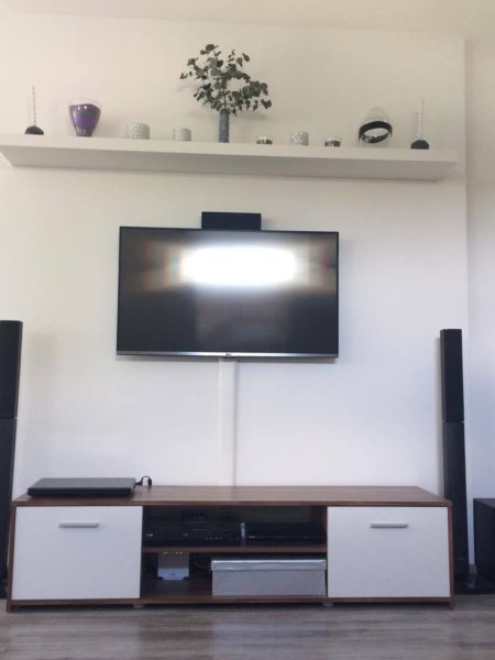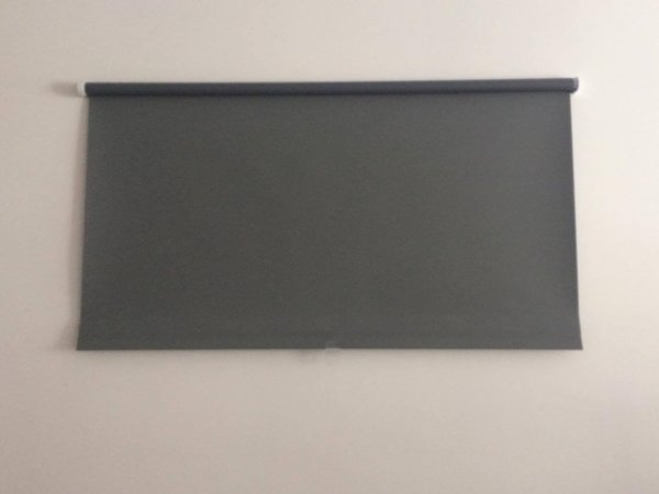 Még egy kritikus árnyékolni való területünk volt, még pedig a nappaliban lévő fektetett ablakunk. Ami történetesen teljesen visszatükröződött a tv-ben. Egy darabig tűrtük, aztán párnákkal eltakartuk, majd ide is ugyanaz a szürke roló lett a megoldás, csak nagyobb méretben 🙂