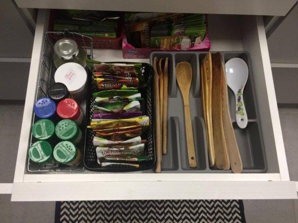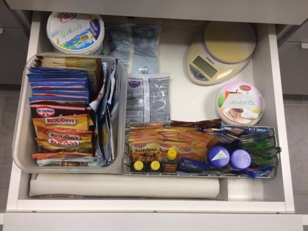 A konyhai fiókokat is átnéztem, áttörölgettem, itt csak 4 üres fűszertartó valamint két serpenyő került a kukába, a rendszer működik! Férjtől kaptam fiókba való csúszásgátlókat is, pár hónapja már két tekercset tettem a leggyakrabban használt helyekre, most pedig újabb kettővel körbe is értem a 12 fiókon. Mindig Tetris-ezek, dobozolok és címkézek, szerintem nagyon mókás és szép lesz a végeredmény.