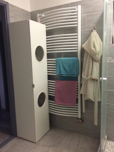 Férj az egyik hétvégés sulis napja után meg is hozta a zsákmányt, a régóta kinézett Lillangen szennyestartó szekrényt, valamint csúszásgátlókat a konyhai fiókjaimba. A szekrény story a következő volt: van a mosógép szekrényem, a dupla mosdó és a Lillangen magas tükrös szekrény. És én azt hittem, hogy a szennyestartó is olyan keskeny, mint az utóbbi. ( Egyszer megnéztem a méreteket, de el is felejtettem…) Hát tévedtem, beismerem. Egyszóval nem fért be a zuhanyzó jobb oldalára, csak az ajtó mellé, kissé eltakarva a törölközőszárítót. De nem bánom, kellett az a szekrény és boldoggá tesz, még így is. A radiátort még a porban mértük fel, így is örülök, hogy meg tudtuk tervezni a fürdőt… Szóval ha az egy kicsit balra került volna, ahh de mindegy is. Jobb oldalra kaptam egy csinos kis akasztót a köntösömnek, így a fürdőt végre késznek tekintem.