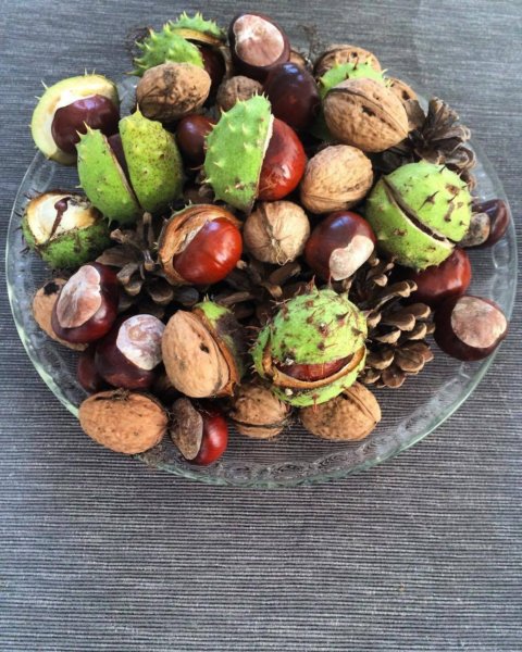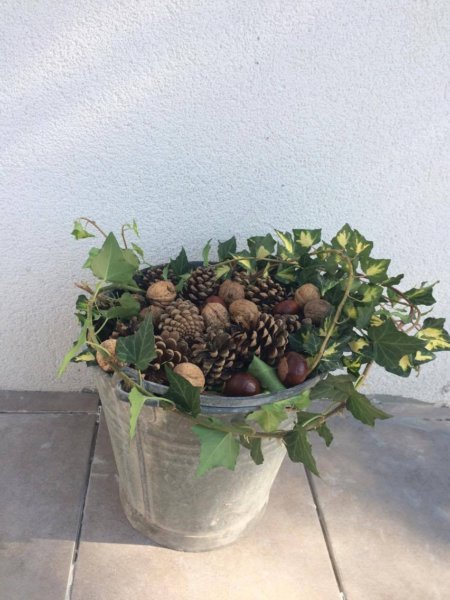 Elkezdtem kicsit dekorálni kint és bent is, csakis termésekkel, valamint begyűjtöttem pár kis zöld növényt, amik köré épült a kaspó festés is. Soha nem tudok két egyforma színt kikeverni, de szerintem ez a jó az akrilban 🙂 A megrepedt bögre pedig új értelmet nyert.