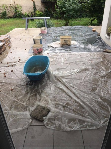 Aztán amikor mindez lecsengett, akkor Após vezényletével és kivitelezésével belevágtunk. Természetesen nekem nem sok szerep jutott – fugkereszteket tördeltem T alakba, kávét főztem, letakartam a kész területet az eső elől és aggódtam szüntelenül, nehogy az elég drága ragasztó kárba menjen – de túléltük. Sparcobeagle persze megint sokat segített…