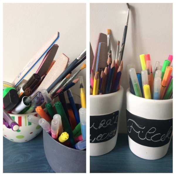 Az asztalomon is rendet raktam, valamint új, írható kaspókba válogattam külön a filceket, külön a ceruzákat.