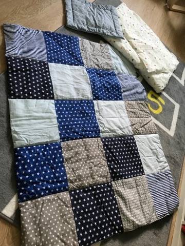 Elkészítette a babafészket, a mintás ágyrács párnákat, méretre igazította az ágyneműket és a huzatokat, puha plüss takarókat,és számunkra a legkedvesebb ezeken felül, hogy meglepett minket – vagyis az unokáját – egy igazi patchwork takaróval, ami szerintem bámulatosan sikerült. Négy méteráru boltot jártunk be, együtt választottuk ki az anyagokat, de semmi más kikötésem nem volt, teljesen Rá bíztam mindent 🙂