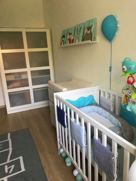 Bal oldalra került egy Malm komód, mint pelenkázó – az én termetemhez a három fiókos passzol – és a Sundvik kiságy, Jysk kókusz+memóriahab matraccal.