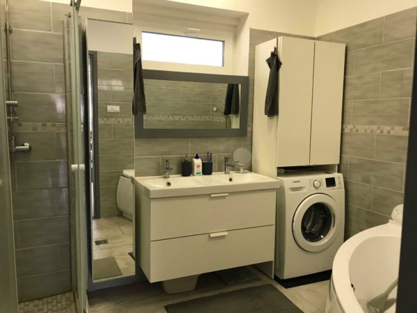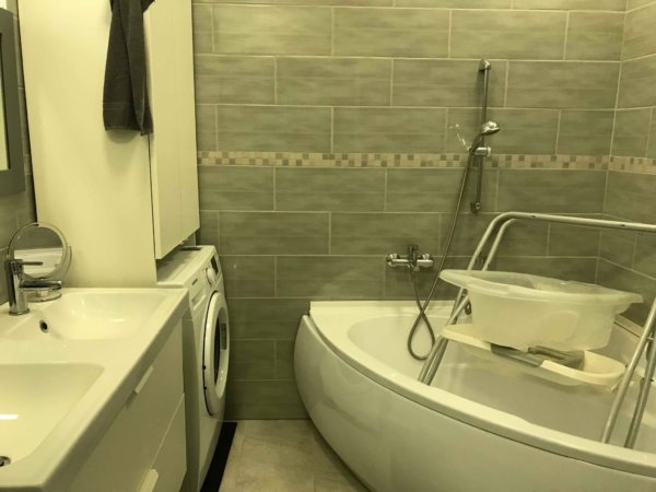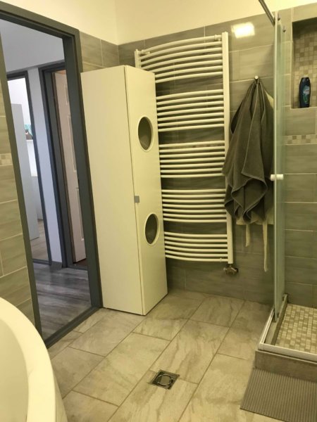 A fürdőszoba kapott egy tükrös szekrényt, egy mosógépet elnyelő szekrényt és egy szennyestartós szekrényt is, ami szintén nem a végső helyén van. Az álványos gyerekkád pedig már csak a sarokkádban fért el. És igen, a kád előlapja a melegtől most naponta kipattan… kellett nekünk hozzányúlni – levágták a fiúk a peremét, másként nem fért volna be. Itt súlyos változások lesznek, de erről is hamarosan.
