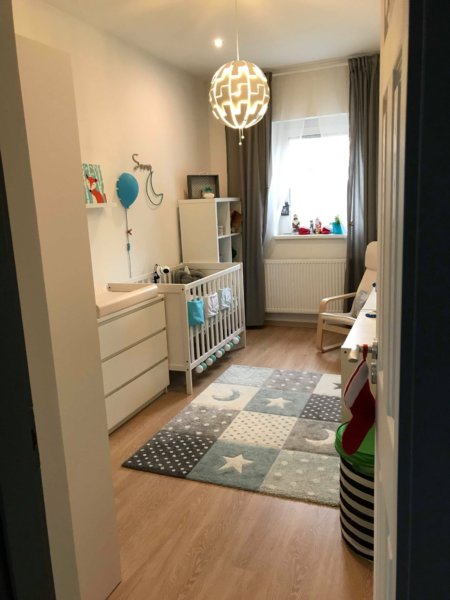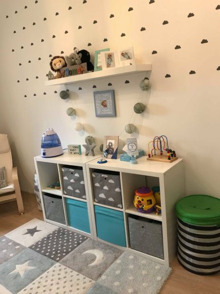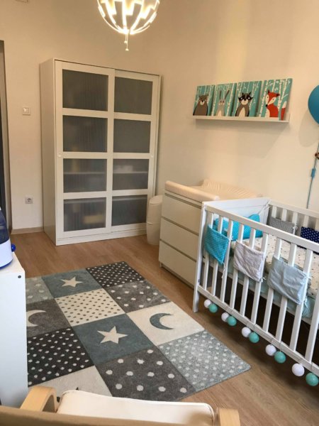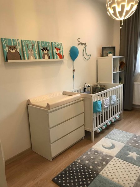 A gyerekszoba is változott picit a kezdeti állapothoz képest – szaporodnak a játékok és a ruhák – így a kiságy mellé bekerült még egy Kallax polcos elem. Funkciók tekintetében a komódon pelenkázás is bevált és a “nagy” gardrób is.